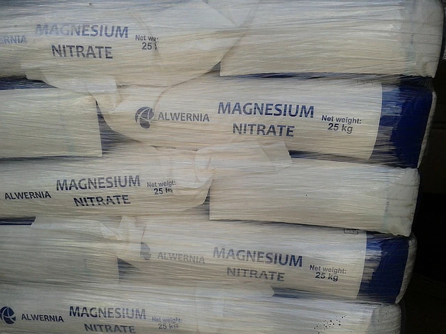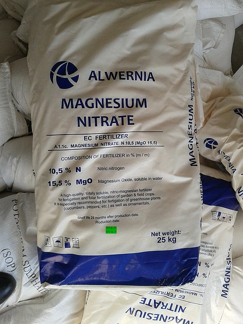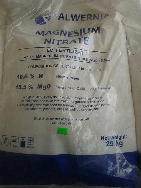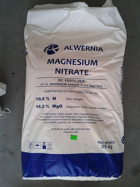 Магниевая селитра Азотно-магниевое  полностью водорастворимое удобрение.  Применяется при поливе и для некорневых подкормок в теплицах и открытом грунте.  Показатель   Химическая формула Mg (NO3)2 * 6Н2О Показатель активности водородных ионов, (рН) 5,5-6,5 Массовая доля магния (MgO), % 15,7 Массовая доля азота (NO3),% 10,9   Рекомендации по применению: Магниевая селитра содержит необходимые растениям магний и азот в нитратной форме, стимулирующие фотосинтез в растениях: ?  Не содержит нежелательных примесей и нерастворимого осадка; ?  Совместима с другими удобрениями; ?  Удобна в использовании; ?  Лучший источник магния на гидропонике; ?  В отличие от сульфата магния может использоваться совместно с кальциевой селитрой.  Культура Доза применения Способ, время, особенности применения препарата Защищенный грунт Концентрация маточного раствора 20%. Концентрация рабочего раствора 0,5 – 1,0 г/л При капельном орошении Овощи в открытом и защищенном грунте 1 – 3 кг на 100 л. воды. Расход воды 1000 л/га   Листовая подкормка. Периодичность подкормки   10-14 дней.   Магниевая селитра особенно эффективна на грунтах, где наблюдаются признаки магниевого голодания. Ее применение удовлетворяет потребность растений в магнии в период всей вегетации.     Роль магния в жизни растений. В условиях интенсивного земледелия все больше применяются безбаластные калийные удобрения. Хозяйства получают более высокие урожаи и, в связи с этим, из грунта выносятся другие макроэлементы, такие как магний, сера и другие. Необходимость удобрения магнием определяют сопоставляя содержание доступного растениям магния, потребность выращиваемых культур и потерями магния в результате вымывания и выноса магния урожаем. Удобрение магнием необходимо, если по результатам почвенного обследования выявлено низкое содержание доступного растениям магния. Недобор урожая может составлять до 40-50% при содержании доступного магния ниже 1 мг/100 г почвы. Особенно хорошо отзываются на внесение магния зерновые и, прежде всего, озимая рожь. Картофель менее чувствителен к низкому содержанию магния в почве, однако лучшее обеспечение магнием положительно влияет на содержание крахмала в клубнях. Достаточное обеспечение магнием также благоприятно влияет на качество корней сахарной свеклы. Потери магния в результате вымывания в значительной мере пропорциональны количеству осадков и в отдельные годы сильно колеблются. Кроме того, они зависят от реакции почвы и уровня удобрения калием. В среднем следует считаться с потерями 5—20 кг Mg на гектар в год. Вынос магния особенно велик с урожаями пропашных и бобовых культур. При расчете уровня удобрения следует учитывать поступление магния с органическими удобрениями. Содержание магния в навозе составляет 0,08% и в жидком навозе — 0,05%. Внесением обычного количества органических удобрений можно покрыть потребность в магнии пропашных культур, но этого недостаточно для всего севооборота. Удобрение магнием кислых почв без их известкования часто приносит успех, тогда как, с другой стороны, недостаток магния можно устранить уже путем известкования и дополнительное удобрение магнием не оказывает никакого действия. На этих почвах следует прежде всего применять доломитизированные известняки. Благодаря применению магнийсодержащих известняков в почву в отличие от ос